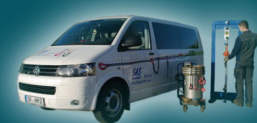 Wir prüfen - Anschlag- und Lastaufnahmemittel nach DGUV 100 - 500 - Winden, Hub- und Zuggeräte nach DGUV Vorschrift 54 - Persönliche Schutzausrüstungen gegen Absturz nach DGUV 112 - 198 - Persönliche Schutzausrüstungen zum Retten nach DGUV 112 - 199 - Zurrmittel nach DIN EN 12195 - Leitern und Tritte gemäß Betr.SichV und DGUV Information 208-016 jährlich in Form einer Sichtprüfung durch einen Sachkundigen. Anschlagketten werden zusätzlich alle 3 Jahre einer zerstörungsfreien Prüfung auf Rissfreiheit unterzogen. Hebezeuge und Hebeklemmen werden auf unserem hydraulischen Prüfstand mit Überlast geprüft. |